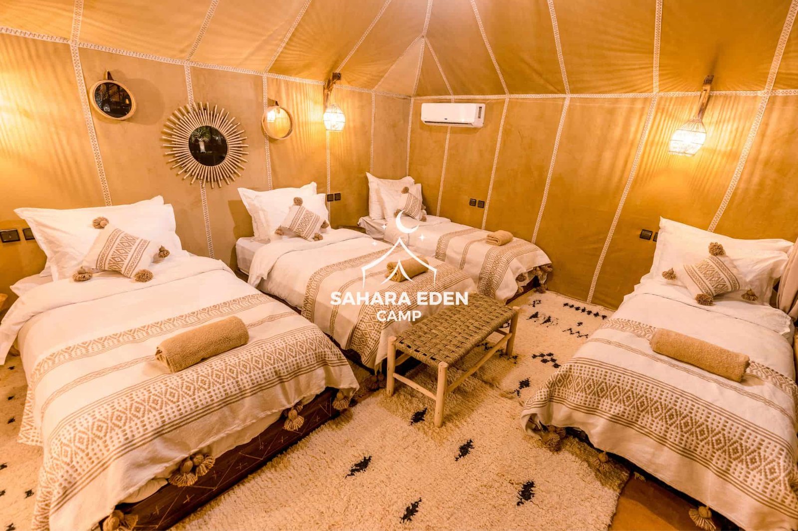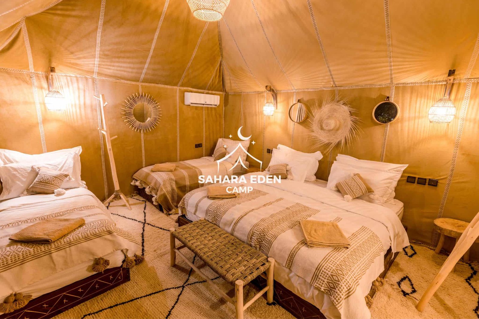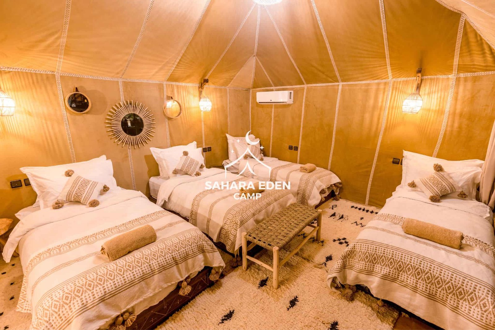The Quadruple Desert Tent with 4 Single Beds at Sahara Eden Camp brings together comfort, space, and authentic desert charm in one of the most serene areas of the Sahara desert camp. Designed for friends, families, and small groups, this spacious tent offers four individual single beds, giving every guest a private, comfortable sleeping arrangement while enjoying a true Sahara luxury experience.