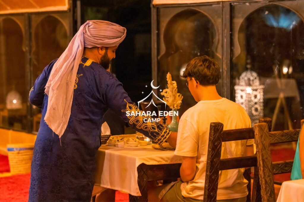Mint Tea & Sweets: End your meal with sweet Moroccan mint tea and homemade pastries, a symbol of Sahara hospitality.