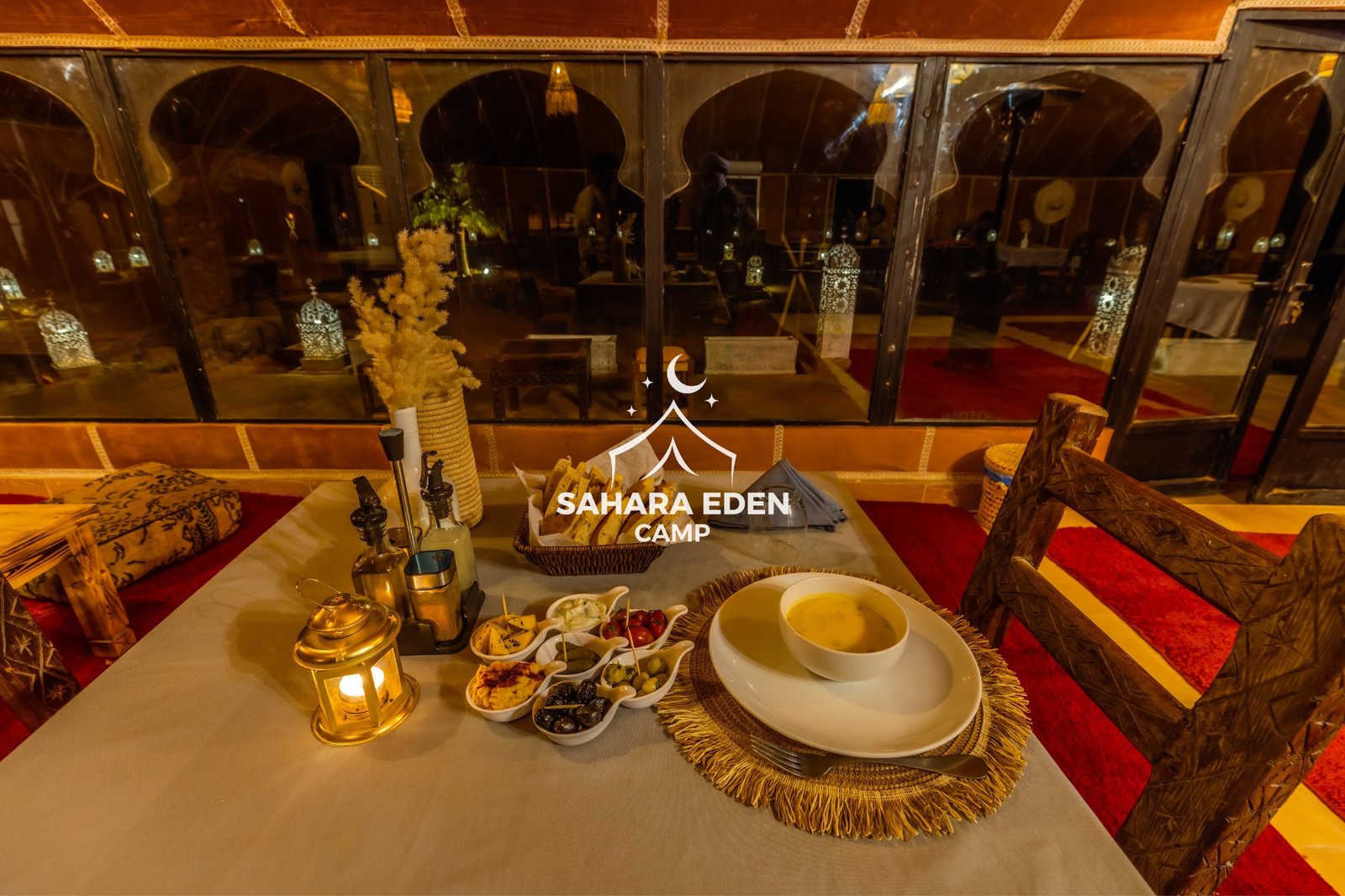 At Sahara Eden Camp, dining is a highlight of your desert journey. Our restaurant serves authentic Moroccan and international dishes, all prepared with fresh, locally sourced ingredients and fully halal. Guests can enjoy flavorful tagines, fresh salads, and traditional bread by day, and magical open-air dinners under the stars by night — a true blend of comfort, culture, and taste in the heart of the Sahara.